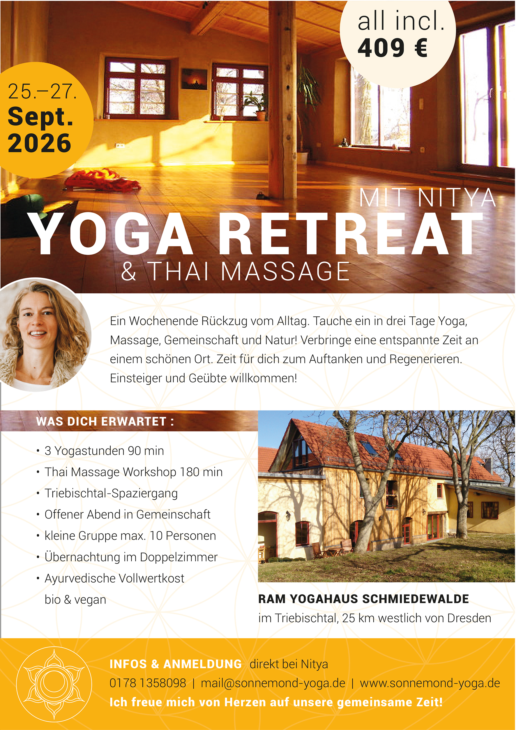 | 25.–27. Sept 2026 | Yoga Retreat mit Nitya | Ram Yogahaus Schmiedewalde | FlyerInfos & Anmeldung hier | |
